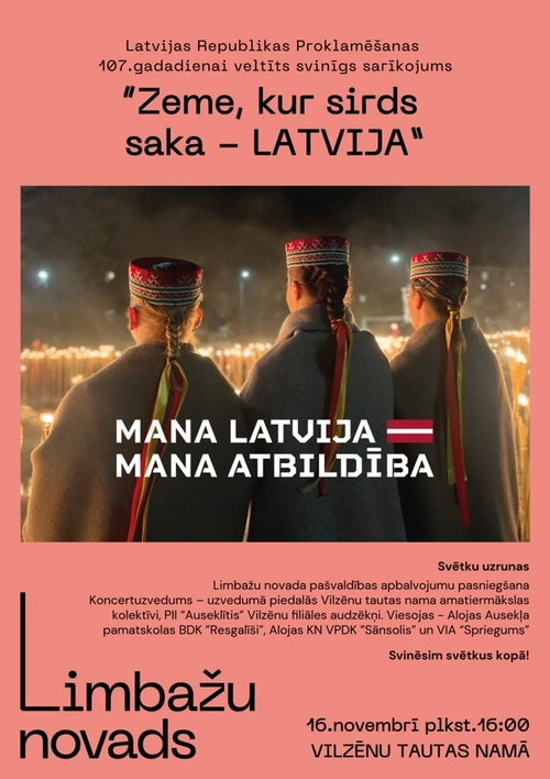16. novembrī Vilzēnu tautas namā norisināsies Latvijas Republikas Proklamēšanas gadadienai veltīts svinīgs sarīkojums “Zeme, kur sirds saka – Latvija”.