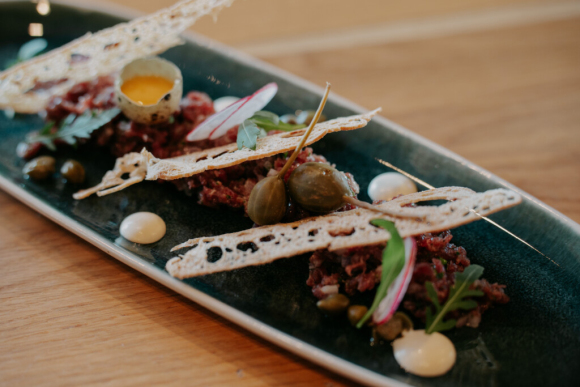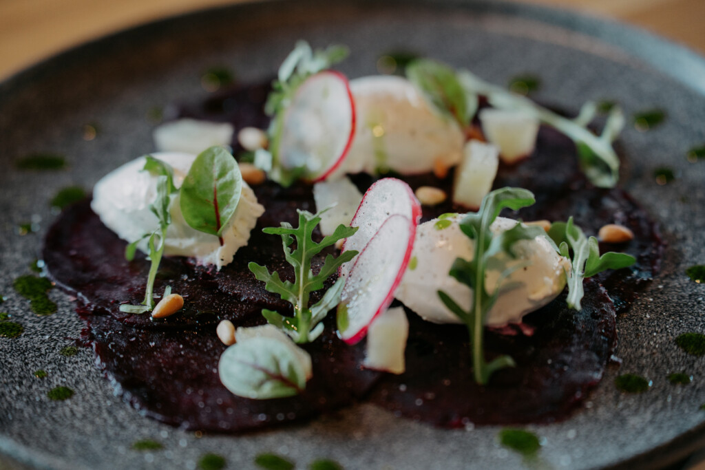 Uzkodas. Biešu karpačo: Rukola, viegli putots kazas siers, ciedru rieksti, zaļumu eļļa vai liellopa gaļas tartars: tumšā Ciabatta, sinepju majonēze, paipalu olas. Alergēni: piens, rieksti, olas, graudaugi, sinepes — pēc nepieciešamības var precizēt.