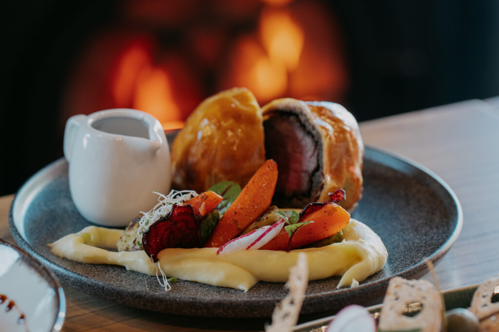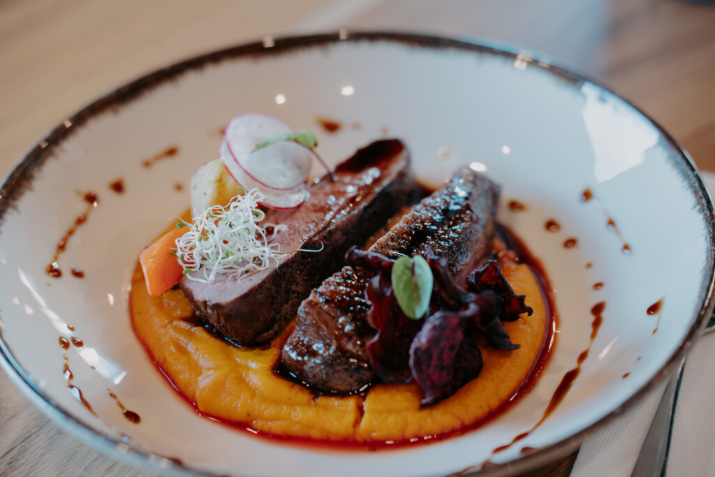 Pamatēdiens. Pīles krūtiņa: batāšu biezenis, ceptas plūmes, biešu čipsi, buljona mērce vai liellopa steiks Wellingtons: kartupeļu biezenis, Briseles kāposti, glazēti burkāni, Madeiras mērce vai risotto ar meža sēnēm: meža sēnes, svaigi pētersīļi, sviests, Parmezāna siers. Alergēni: piens; olas; graudaugi — pēc nepieciešamības var precizēt.