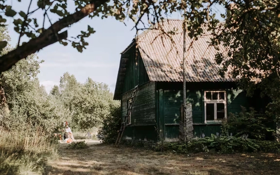 The house is located deep in the forest, surrounded by wild meadows, just a 15-minute drive from the Baltic Sea. It includes two bedrooms, a living room, and a kitchen. A dry composting toilet is located nearby. Next to the house, there is an old barn with a traditional wood-fired sauna and a partially open dining area with a view of a natural pond, perfect for a refreshing dip after the sauna.