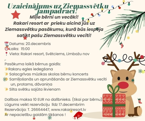 20. decembrī Rakari Resort aicina uz Ziemassvētku jampadraci – Salacgrīvas Mūzikas skolas audzēkņu koncerts un tikšanās ar Ziemassvētku vecīti.