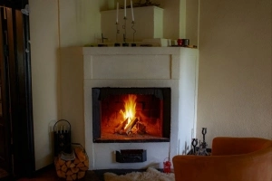 Antrame aukšte – jauki židinio salė su dideliu šeimyniniu stalu iki 24 žmonių.