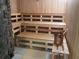 Pirtelė yra atskirai nuo svečių namų, dviejų aukštų pastate.