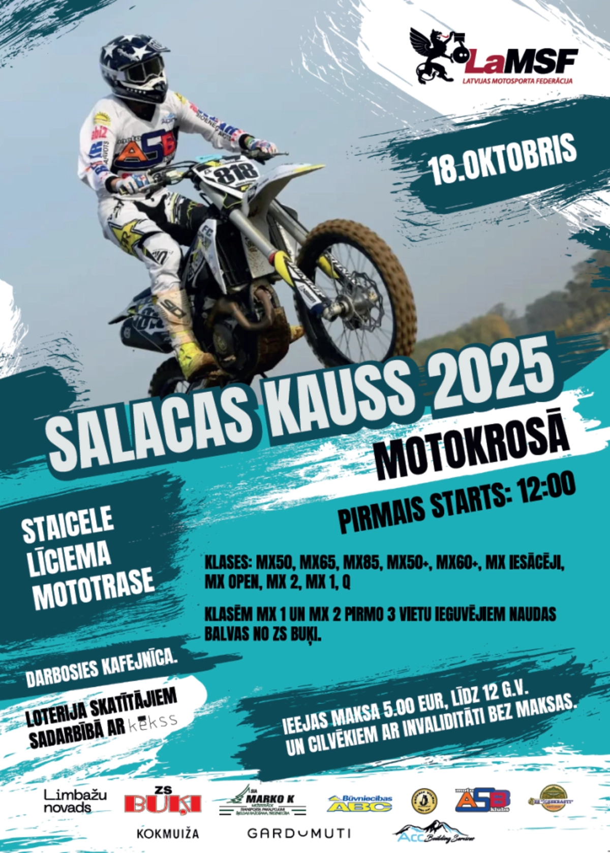 18. oktobrī Līciema mototrasē norisināsies motokrosa sacensības “Salacas kauss 2025”. Pirmais starts plkst. 12.00.