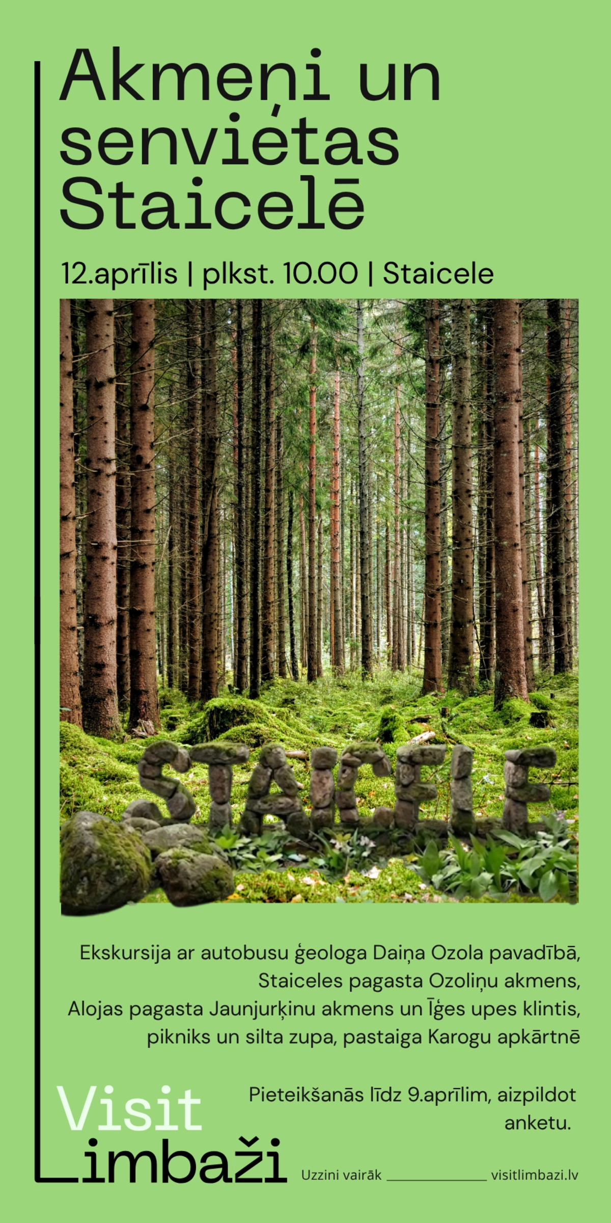 Ar aizraujošu satikšanos dabā 12. aprīlī turpināsies jau trešais Limbažu novada pārgājienu cikla piedzīvojums, kurā kopā ar ģeologu Daini Ozolu dosimies izzinošā maršrutā pa Staiceles tuvāko apkārtni. Lai pilnvērtīgi iepazītu plašo apskates vietu kopumu, šajā pārgājienā pārvietosimies ne vien kājām, bet no vietas uz vietu dosimies ceļā ar organizatoru nodrošinātu autobusu.
