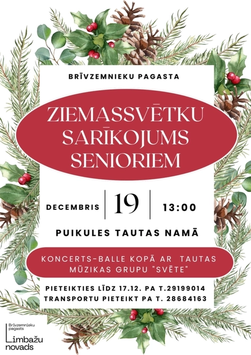 20. decembrī Alojas kultūras namā notiks Senioru Ziemassvētku balle, kurā spēlēs Lintars un Jana; dalības maksa – 15 EUR, pieteikties līdz 15. decembrim pa tālruni 29407312.