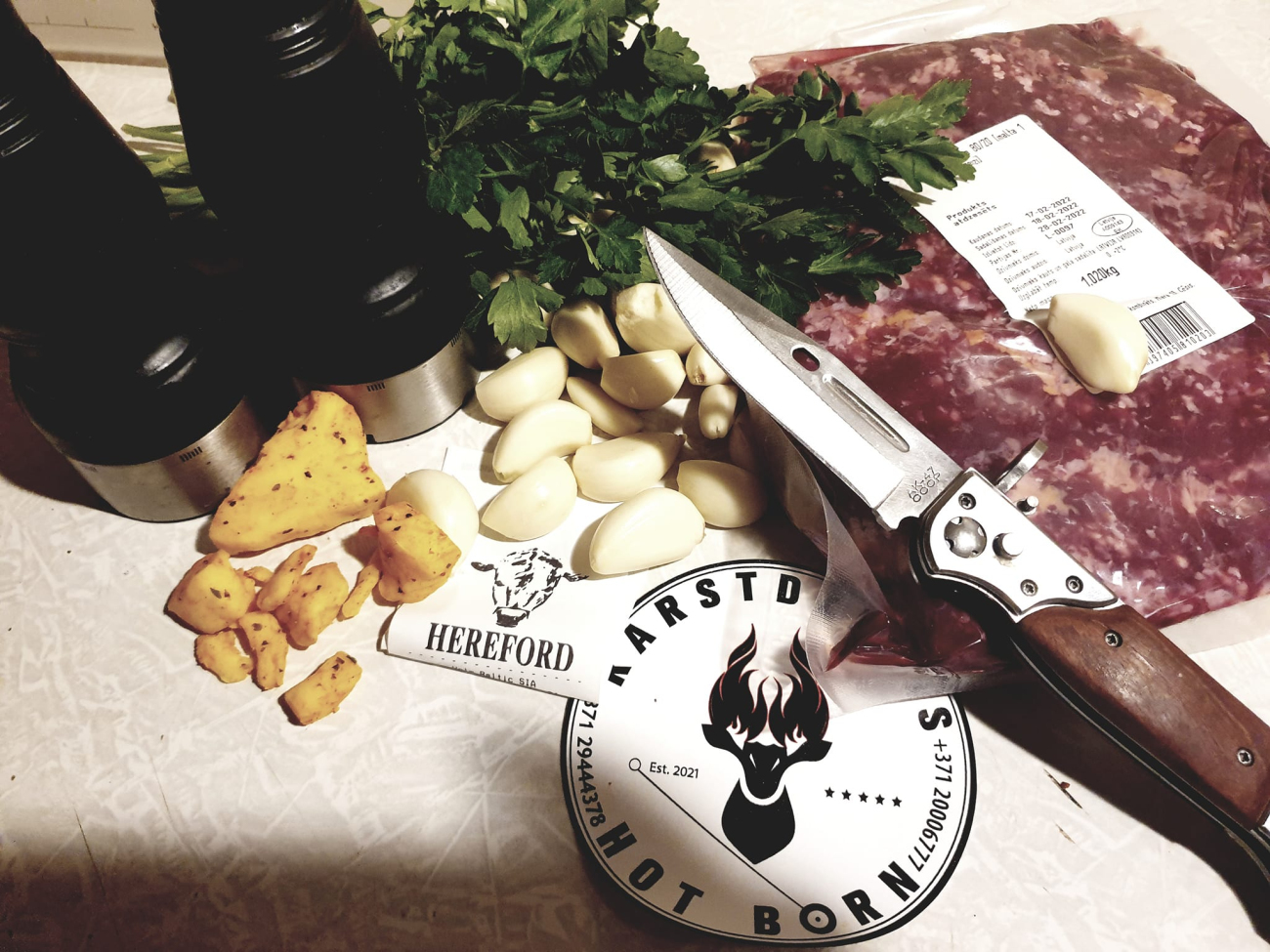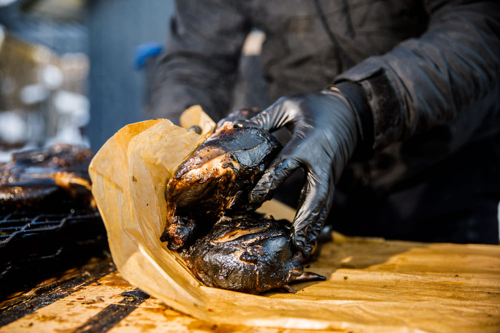 Pamatēdiens. Vietējo lauksaimnieku cūkgaļas šašliks, marinēts kefīrā un gaišajā alū ar sīpoliem, ķiplokiem un Karstdzimis garšvielām, gatavots kamado keramikas grilā ar Manenburg oglēm un pasniegts ar sviestā vārītiem kartupeļiem, svaigiem salātiem krējuma mērcē un mājas šašlika mērci.