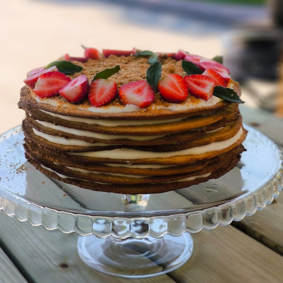 Deserts. Pašu gatavota daudzslāņu medus kūka ar Philadelphia krēmsiera pildījumu, medu, pūdercukuru un iebiezināto pienu, gatavota no dabīgā vietējās piekrastes bišu saimniecības medus.