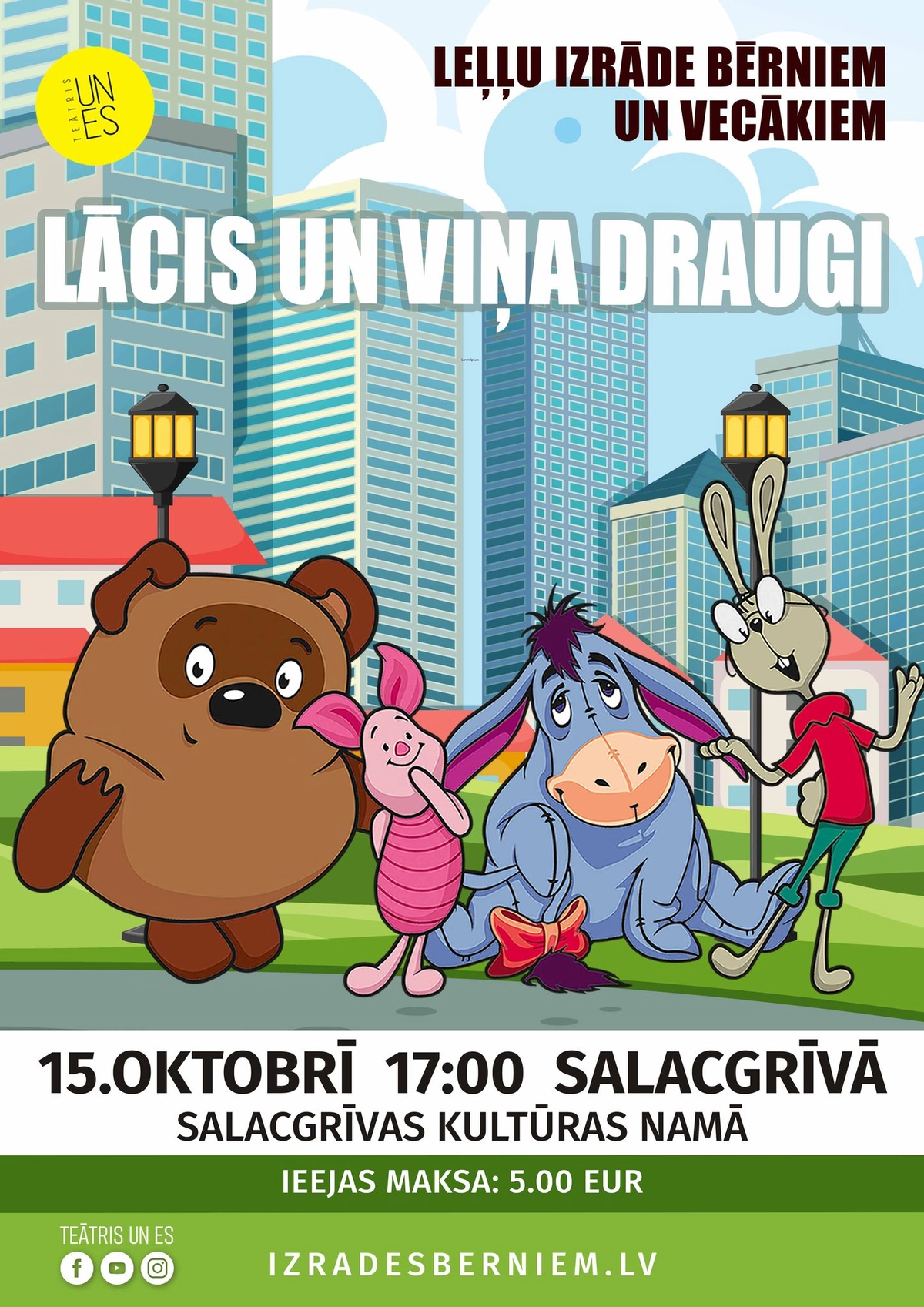 Leļļu izrāde LĀCIS UN VIŅA DRAUGI ir stāsts par Lāci, kurš ir ļoti čakls, apzinīgs un tālredzīgs lācis. Viņš ir strādājis visu vasaru un tagad varētu mierīgi iet gulēt līdz pavasarim. Bet...Lācis nevar aizmigt un saprot, ka ir jāizdomā, par ko sapņot garajā gulēšanas laikā. Un tā, Lācis dodas pie draugiem, lai uzzinātu, par ko sapņo viņi. Vispirms viņš dosies pie Sivēns, kur abi cīnīsies ar bitēm, lai tiktu pie medus, kas padara saldākus sapņus! Tad viņi apciemos Trusi, kurš nu nemaz nebūs gaidījis tik ēdelīgus ciemiņus! Un skat, laiks doties pie drauga Ēzelīša, kuram, izrādās, šodien ir dzimšanas diena! Tagad tikai jāatrod dāvana, jāsatiek Pūce un dzimšanas diena būs izdevusies! Un skat, iedvesmojies no draugu sapņiem un piedzīvojumiem, nu Lācim ir skaidrs, par ko viņš tagad sapņos! Šī izrāde ir domāta visiem – mazliet lielākiem un pavisam maziem skatītājiem. Varbūt kādam šī var būt arī pirmā iepazīšanās ar teātri! Pēc izrādes mazajiem būs iespēja nofotogrāfēties ar lellēm, kā arī aprunāties un varbūt kāds būs tik drosmīgs, lai arī iepazītos ar pašu Lāci!Ieejas maksa: 5,00 EUR