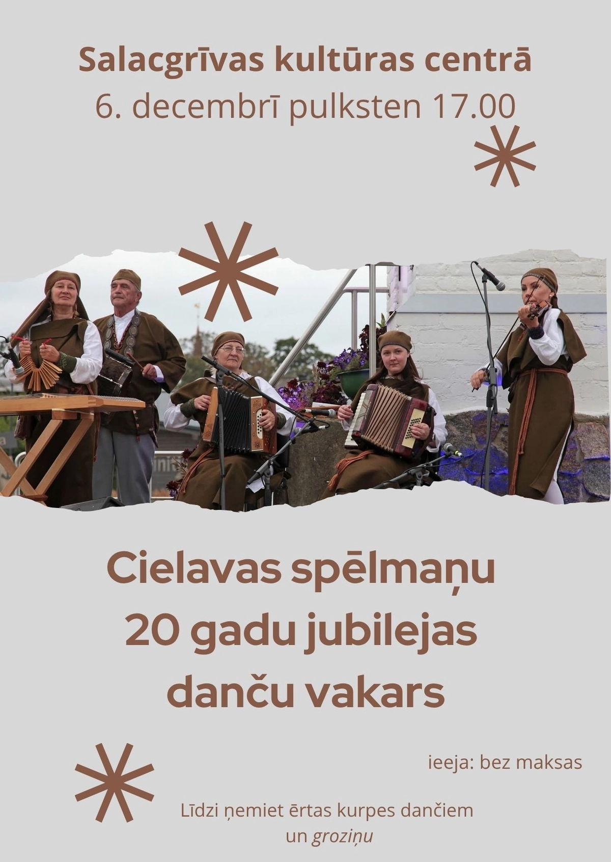 20. decembrī Salacgrīvas kultūras centrā “Cielavas spēlmaņi” aicina uz savu 20 gadu jubilejas svinībām – lustīgu danču vakaru ar dziesmām, dejām un jautru noskaņu.