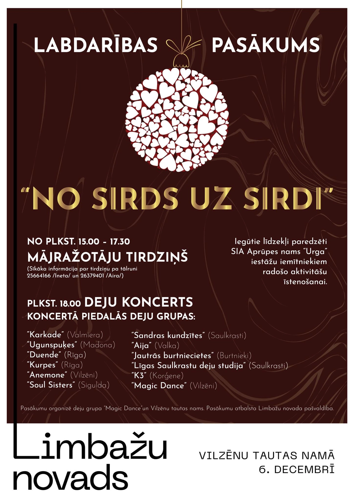 Tirdziņš: no plkst. 15:00 – 17:30 – iespēja iegādāties svētku dāvanas un našķus.Deju koncerts: plkst. 18:00.