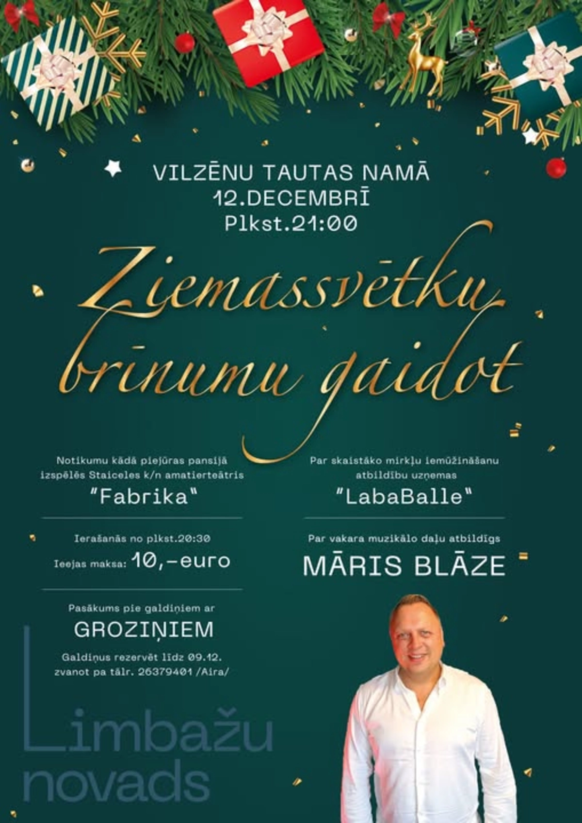 12. decembrī Vilzēnu tautas namā notiks balle “Ziemassvētku brīnumu gaidot”, par mūziku rūpēsies Māris Blāze.
