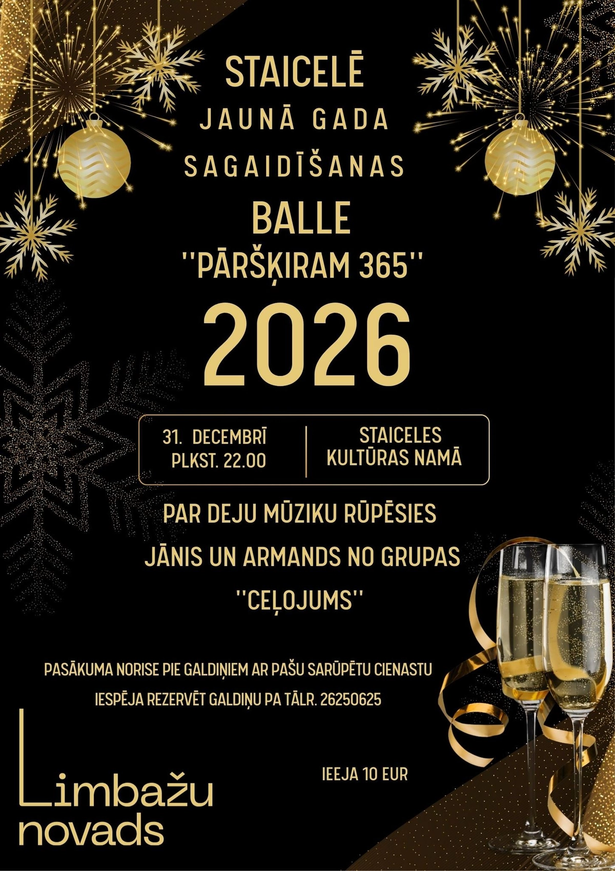31. decembrī Staiceles kultūras namā norisināsies Jaunā gada sagaidīšanas balle “Pāršķiram 365”. Par ballīti rūpēsies Jānis un Armands no grupas “Ceļojums” – dejas līdz rītam!