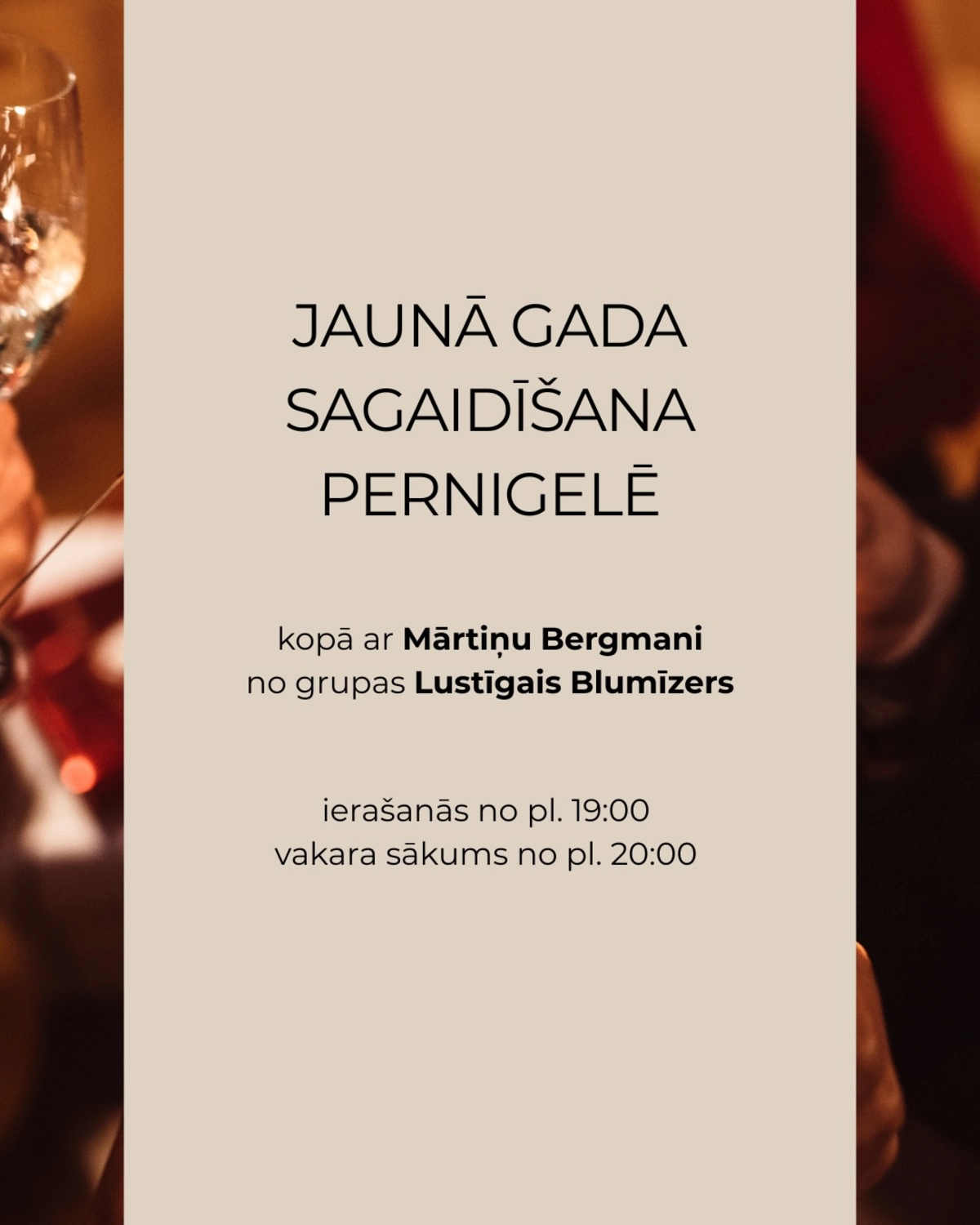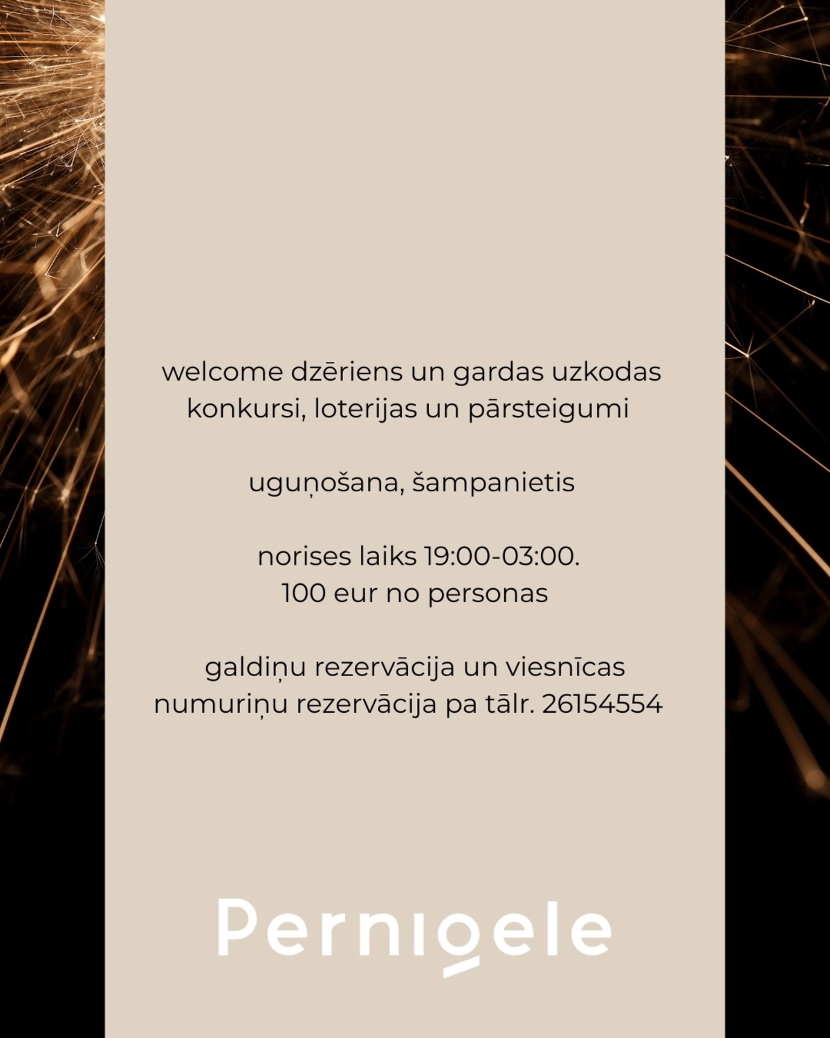 Jaunā gada svinības Grill House & Hotel “Pernigele”! Par muzikālo noskaņu rūpēsies Mārtiņš Bergmanis no grupas “Lustīgais Blumīzers”. Viesus sagaidīs welcome dzēriens un gardas uzkodas, prieku radīs konkursi, loterijas un pārsteigumi. Pusnaktī – uguņošana un šampanietis.