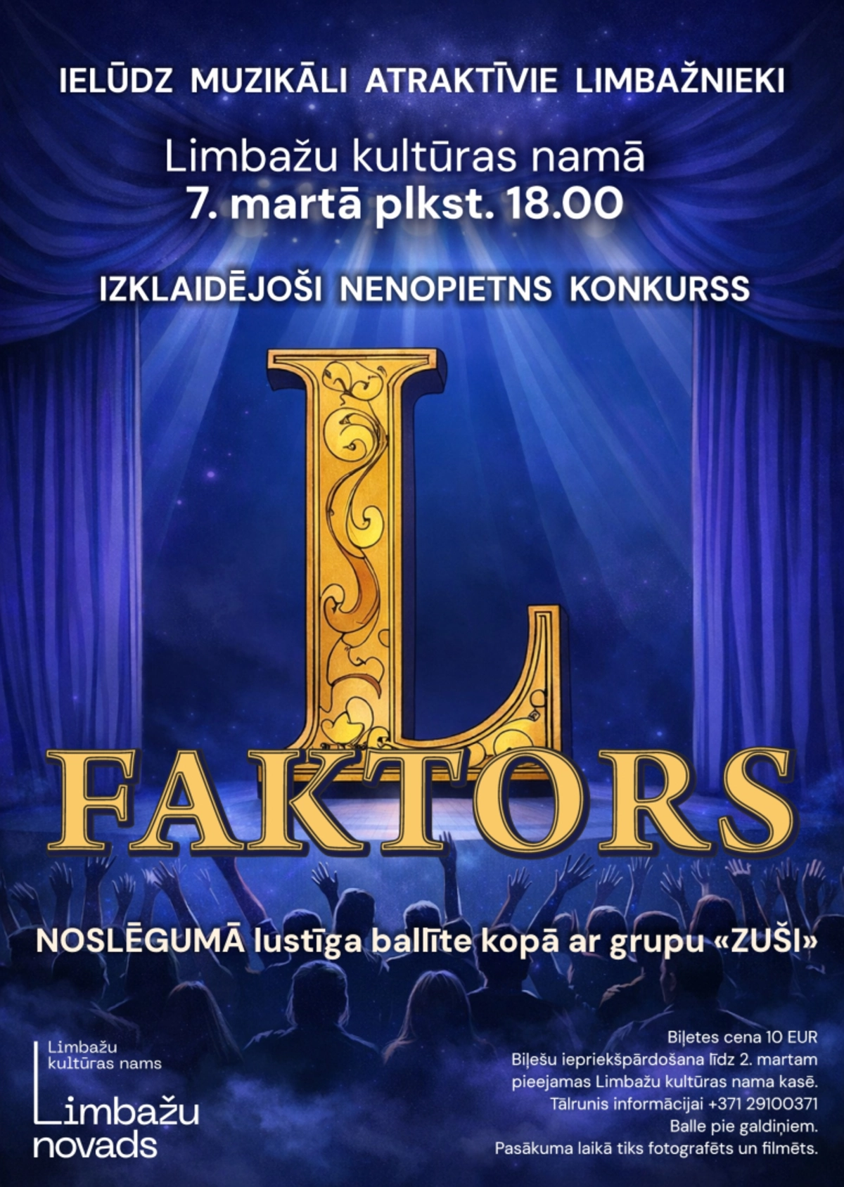 7. martā Limbažu kultūras namā notiks izklaidējoši nenopietns konkurss “L Faktors”, kura noslēgumā paredzēta lustīga ballīte kopā ar grupu “Zuši”. Biļešu cena – 10 EUR. Biļešu iepriekšpārdošana līdz 2. martam, pieejamas Limbažu kultūras nama kasē.