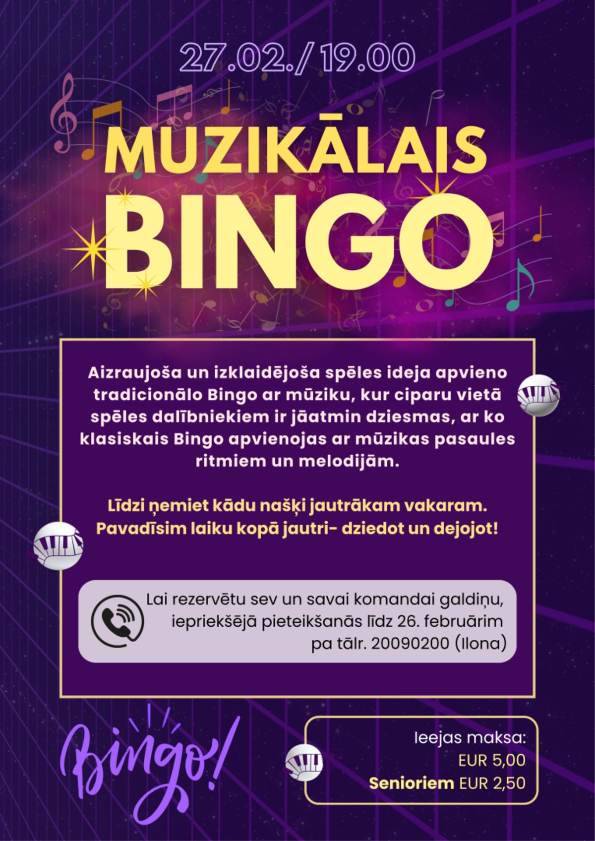 27. februārī Salacgrīvas kultūras centrā notiks aizraujoša un izklaidējoša spēle, kur tradicionālais Bingo apvienojas ar mūziku — ciparu vietā spēles dalībniekiem būs jāatmin dziesmas, ļaujot klasiskajam Bingo satikties ar mūzikas pasaules ritmiem un melodijām. Līdzi var ņemt kādu našķi jautrākam vakaram. Pavadīsim laiku kopā jautri — dziedot un dejojot!