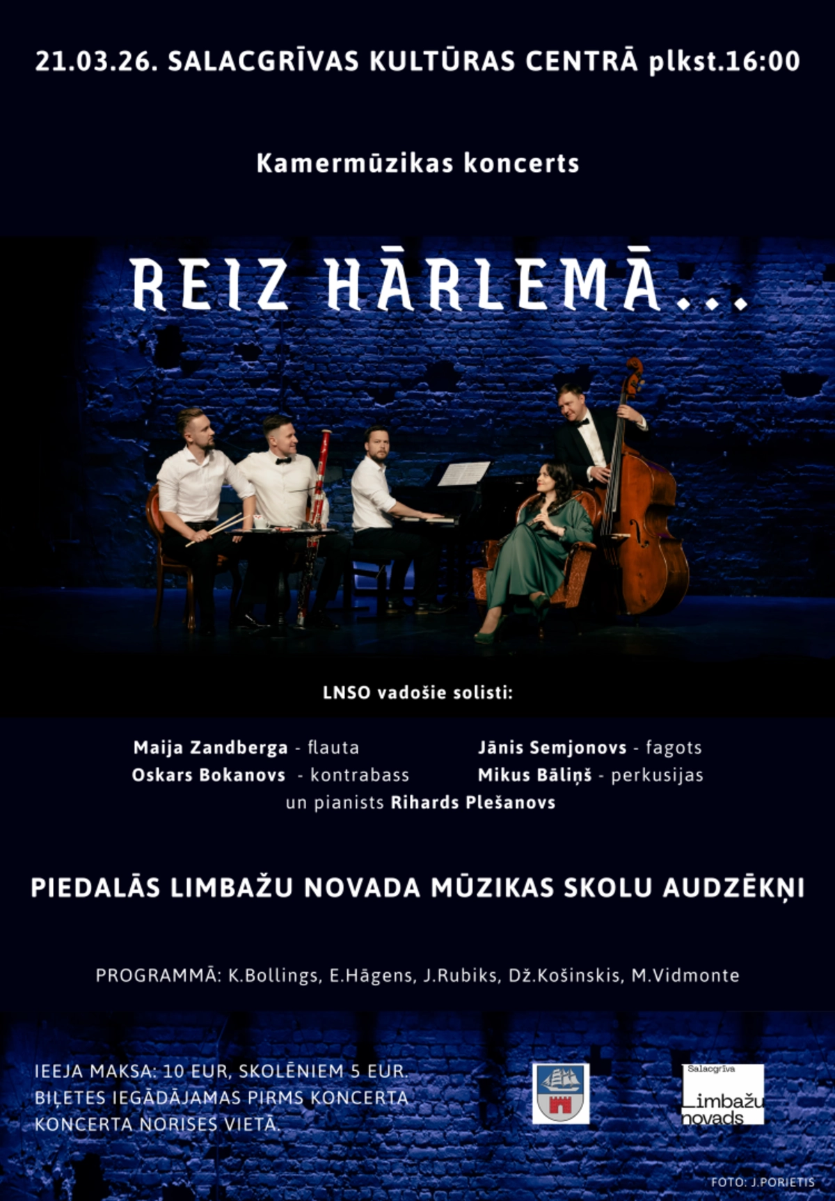 21. martā plkst. Salacgrīvas kultūras centrā notiks kamermūzikas koncerts “REIZ HĀRLEMĀ” ar LNSO vadošajiem solistiem – Maiju Zandbergu (flauta), Oskaru Bokanovu (kontrabass), Jāni Semjonovu (fagots), Miku Bāliņu (perkusijas) un pianistu Rihardu Plešanovu, piedaloties arī Limbažu novada mūzikas skolu audzēkņiem; programmā K. Bollings, E. Hāgens, J. Rubiks, Dž. Košinskis un M. Vidmonte.