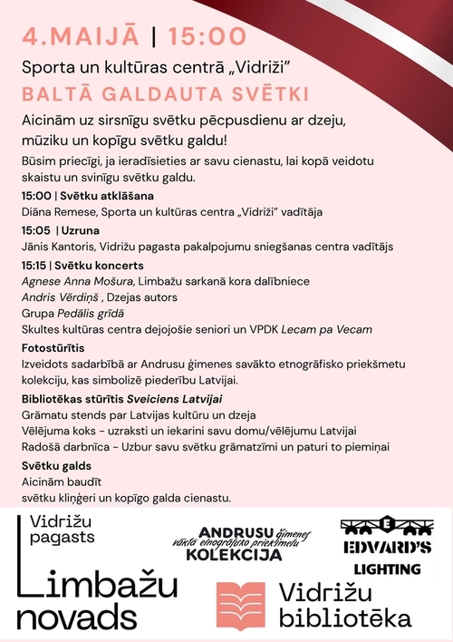 4.maijā plkst. 12.00 Limbažos, Burtnieku kvartālā aicinām uz Latvijas Republikas Neatkarības atjaunošanas 36. gadadienas svinīgo atzīmēšanu.
