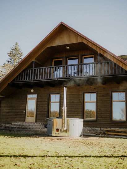 2. Mednieku māja - Mednieku stilā iekārtota viesu māja ar omulīgu kamīna zāli.