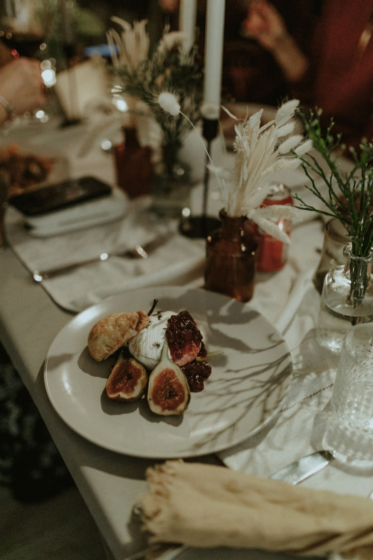 Uzkoda. Biešu, ananāsu un svaigsiera terīne ar karamelizētām vīģēm un balzamiko pērlēm. Alergēni: piens un tā produkti.